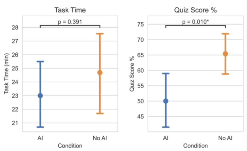 The time it took them to do this with or without AI wasn’t statistically different. The AI group was about two minutes faster, but that’s well within noise, so the group using AI didn’t get a meaningful speed boost.