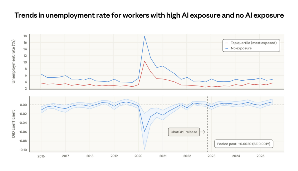 The unemployment rate for the most AI-exposed occupations hasn’t diverged from the baseline since ChatGPT’s release. This is important: the sky hasn’t fallen. The doom predictions are wrong so far.