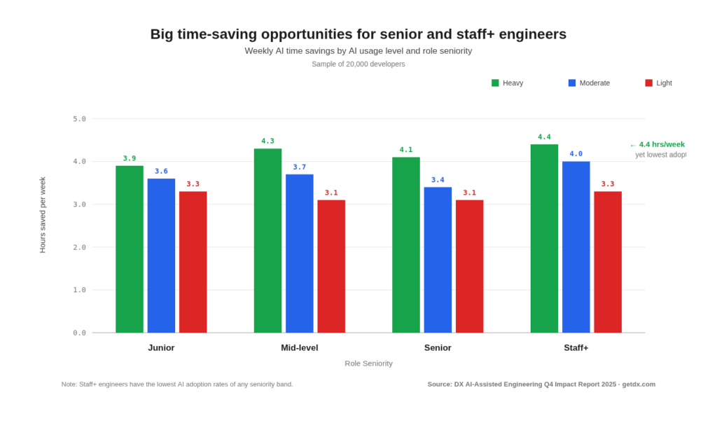 A report from DX (of 20,000 developers) dated from Q3 last year shows the rate of adoption skews toward less tenured engineers. Senior engineers, despite having the lowest adoption rates, who do use AI daily save the most time (4.4 hours/week).