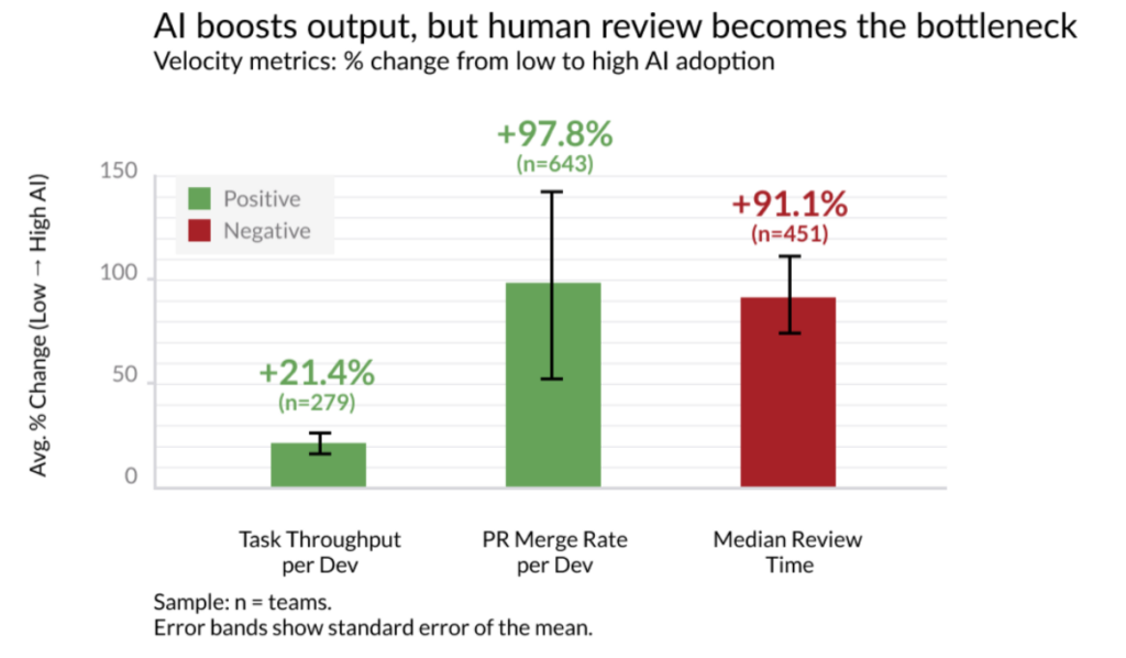 The empirical data supports this emotional narrative. Faros AI’s productivity paradox report, analysing telemetry from 10,000 developers across 1,200 teams, found that teams with high AI adoption complete 21% more tasks and merge 98% more pull requests. But PR review time increases 91%, bugs-per-developer rise 9%, and average PR size inflates 154%.