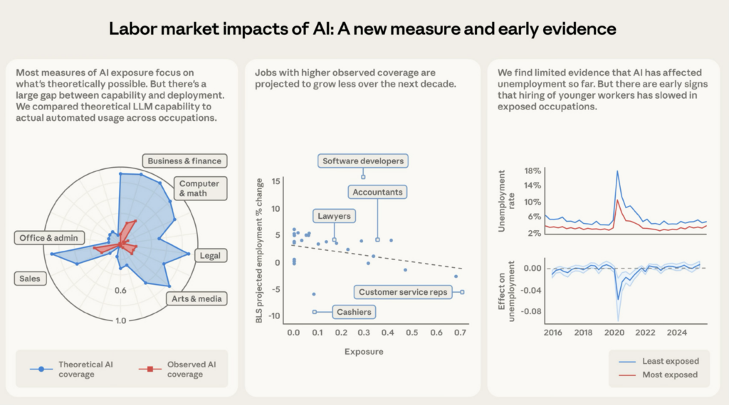 Occupations with higher observed exposure are projected by the Bureau of Labor Statistics to grow less through 2034. For every 10 percentage point increase in AI task coverage, the US government’s growth projection drops by 0.6 percentage points. The labour market analysts are already pricing in the displacement. No systematic increase in unemployment for highly exposed workers, yet.