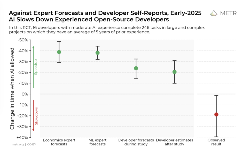Remember the METR study? Experienced developers using AI tools took 19% longer to complete tasks. Before starting, they predicted AI would make them 24% faster. After finishing, they still believed they’d been 20% faster.