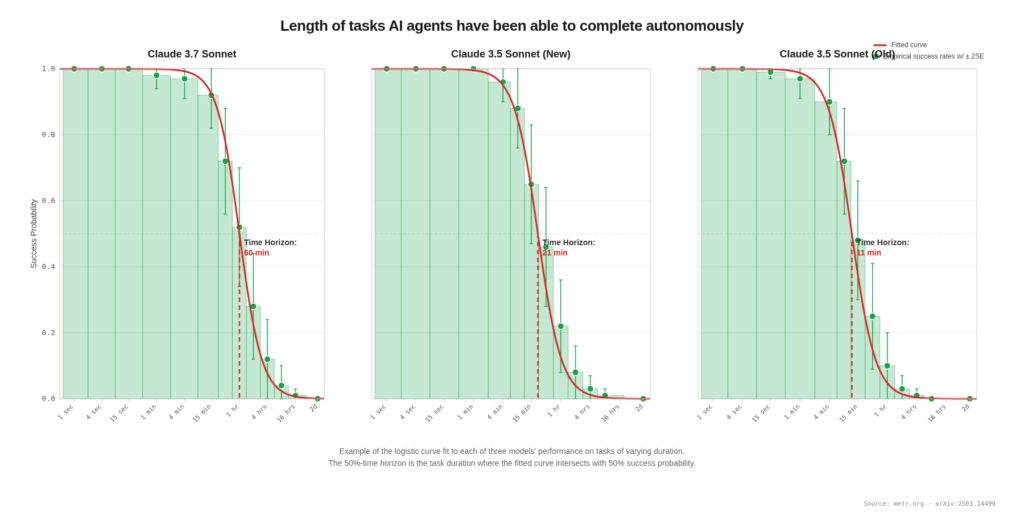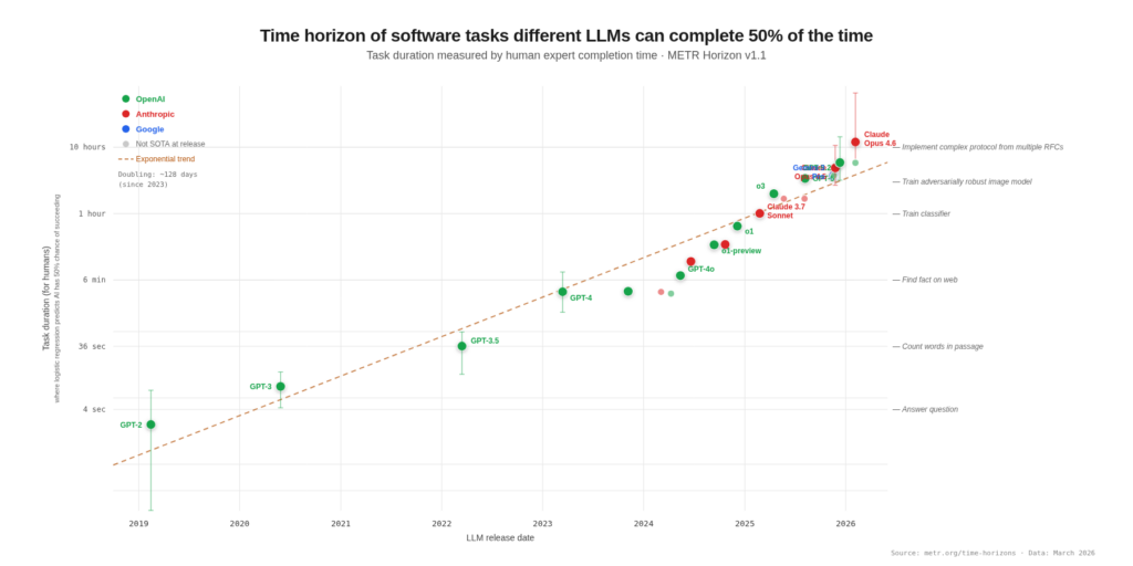 METR benchmarks the “50%-task-completion time horizon“, the length of human-calibrated tasks that AI agents can complete with 50% reliability. Their headline finding: the length of tasks AI can handle autonomously has been doubling roughly every seven months since 2019, accelerating to roughly every four months since 2024.